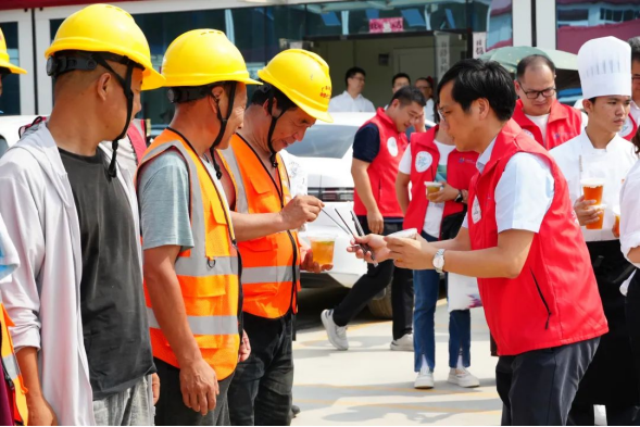 結合高溫天氣需求,順德職業技術大學烹飪學院“百千萬工程”青年突擊隊師生提前抵達現場,制作消暑飲品,由校領導與施工單位負責人共同為一線建設者送去清涼關懷。