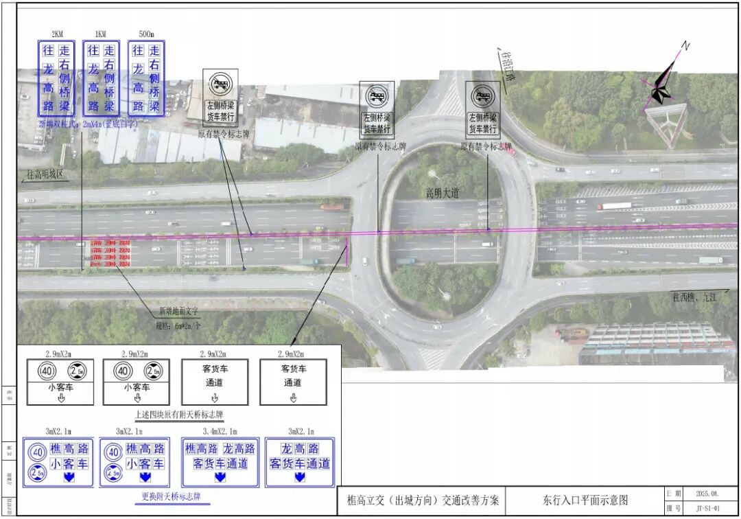 一、調整主要內容 本次交通組織調整內容包括: 1、新增車道地面指示文字;增設、更新路面指示標牌,引導車輛提前選擇車道; 2、在出城方向高明大橋舊橋下橋位(樵高立交)增設波形護欄,減少車流交織,防范違規變道,降低事故風險。 二、出行提示 請途經該路段的駕駛員朋友注意以下事項: 1、提前規劃駛入相應車道:出城方向車輛請根據現場交通標志指引,減速慢行,提前駛入相應車道。 ? 前往龍高路方向的車輛,請提前靠右,行駛右側兩車道通過右側橋梁; ? 前往樵高路方向的車輛,請行駛中間兩車道及左側一車道。 2、如前往龍高路方向誤入高明大橋舊橋,請勿在下橋位停留、倒車或強行變道,應繼續前行至“樵高路南海發電廠路口”掉頭返回。安全第一,繞行不遠。 高明大橋東出口(高明側)交通改善方案 高明大橋東出口(南海側)交通分流導改方案 祝您出行平安!