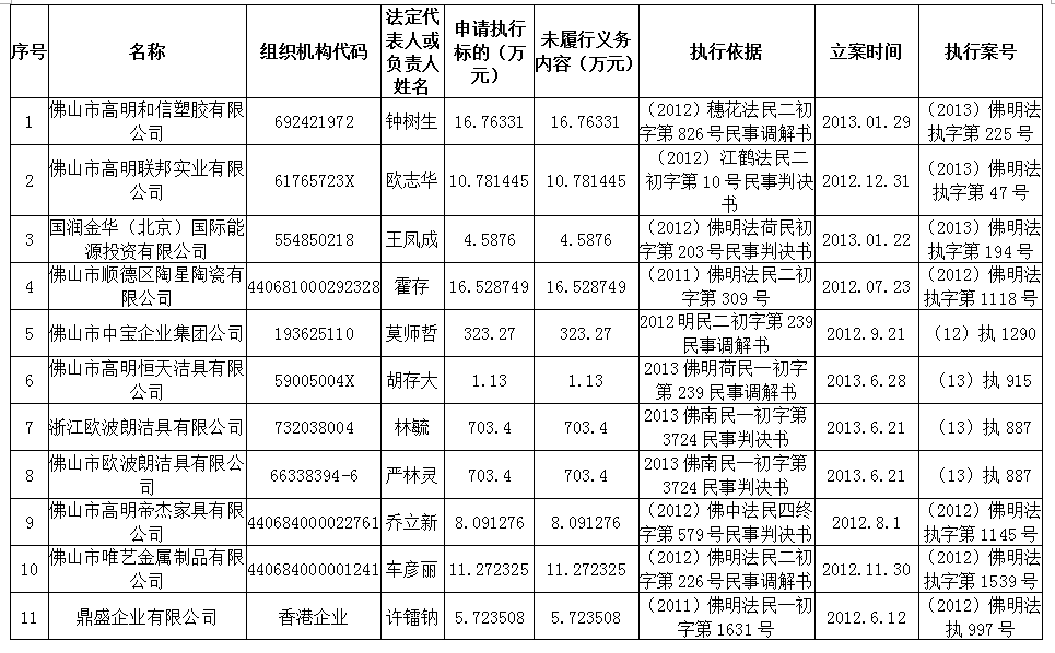 高明法院2013年第二季度老賴名單(法人及其他組織)