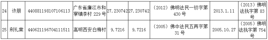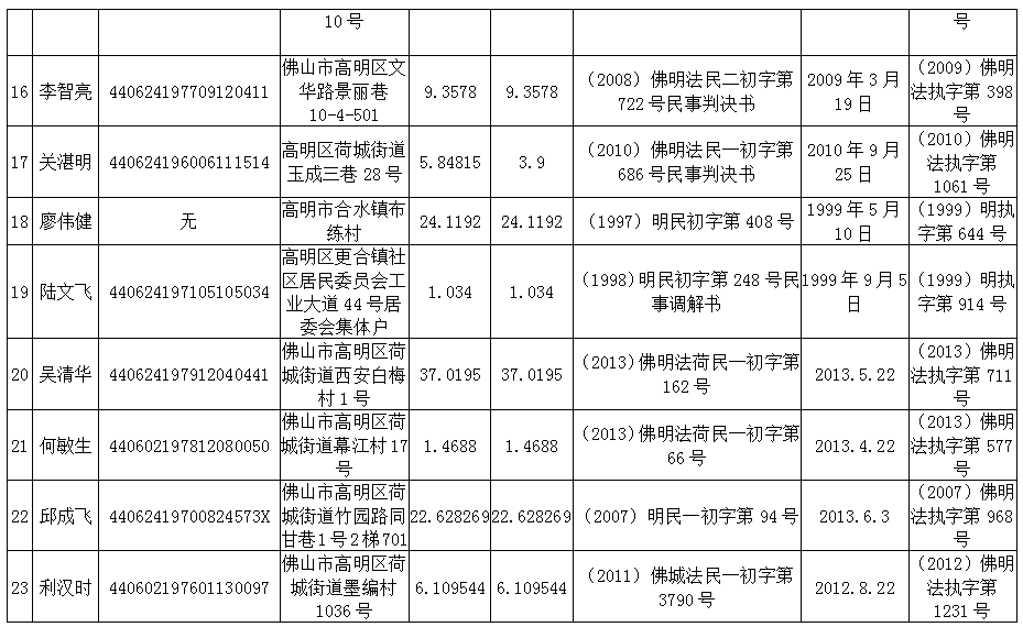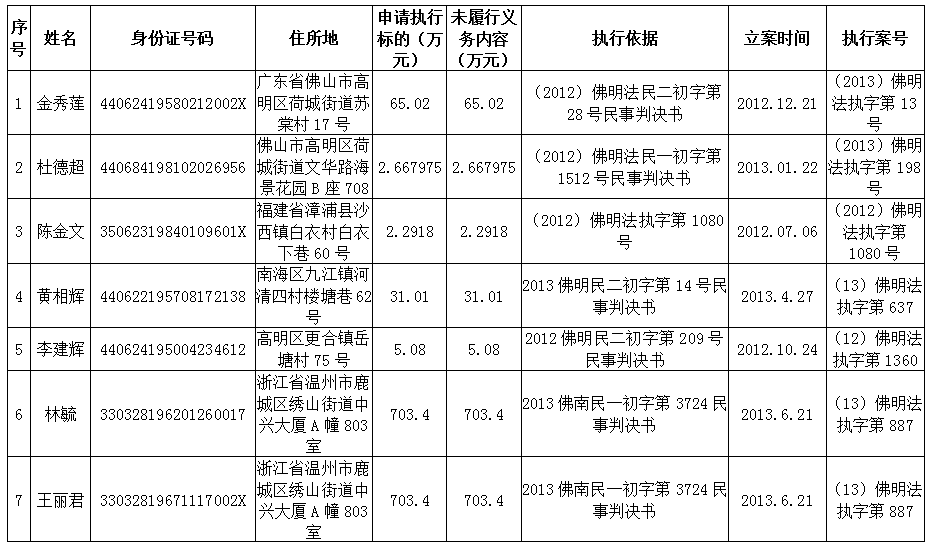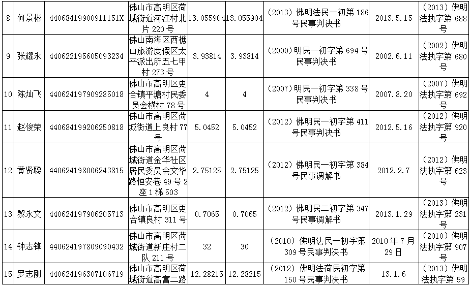 高明法院2013年第二季度老賴名單(自然人)