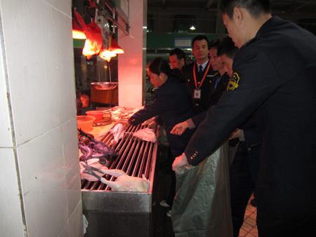 四、加大執(zhí)法檢查力度,確保農(nóng)產(chǎn)品質(zhì)量安全。圍繞農(nóng)貿(mào)市場及其周邊深入開展專項(xiàng)執(zhí)法行動(dòng)和各類專項(xiàng)整治行動(dòng),共開展了水發(fā)產(chǎn)品、湯料類專項(xiàng)整治、打擊病死豬肉專項(xiàng)整治等行動(dòng)。采取檢打聯(lián)動(dòng)、部門聯(lián)合等形式,打防結(jié)合,不斷規(guī)范農(nóng)產(chǎn)品經(jīng)營市場秩序的行為,依法保障食用農(nóng)產(chǎn)品質(zhì)量安全,維護(hù)群眾合法權(quán)益。在打擊病死豬肉專項(xiàng)行動(dòng)中,抽檢豬肉及其制品56批次,合格率為100%。搗毀位于高明富灣陳家村的無證經(jīng)營的燒鹵熟肉黑加工作坊1家,查獲約5公斤涉嫌無合法來源的肉品。