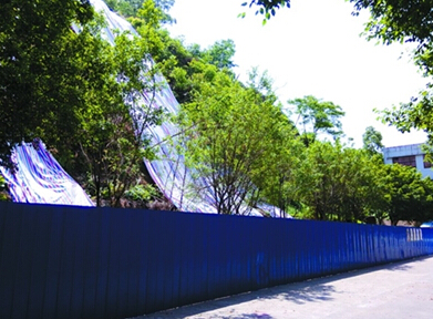 前段時間,高明極端天氣頻發,作為高明區最后一個威脅百人以上的地質隱患點,黃翁山一直備受政府部門和市民關注。記者昨日來到區計生站后面的黃翁山西側,山坡腳已被長長的彩鋼板圍閉,山坡上茂盛的樹木也被砍伐。為防止暴雨沖刷,陡峭的山體上覆蓋著6條巨幅彩條布,但因上周末的大風天氣,中間的彩條布已被掀開,露出了裸露的山土。