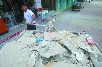 6日,在高明荷城文昌路上,一位工人清理裝修后的建筑垃圾。/佛山日報(bào)記者黎漢沿?cái)z