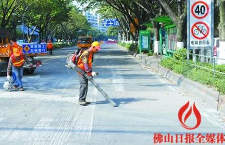 12月19日,荷城荷香路明都廣場路段正在維修,工人利用吹風機清理碎石。/佛山日報記者黎漢沿攝