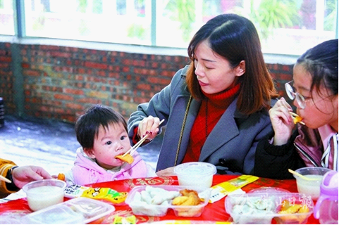 角仔宴上,家長帶著孩子品嘗美味的角仔,感受傳統節日氣氛。