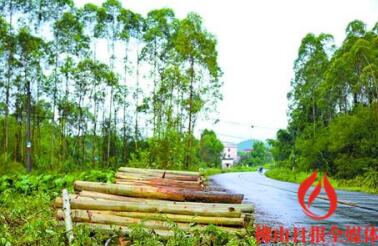 6月21日,高明更合鎮平塘村一處農田內種植的桉樹已被砍伐,木樁整齊地堆放在路邊。/佛山日報記者黎漢沿攝