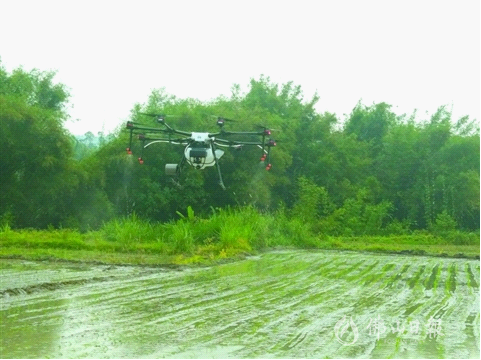 插秧等工序完成后,一臺農藥噴灑無人機就迅速起飛,在稻田上空盤旋巡邏。只見在操控人員的控制下,無人機迅速而均勻地在稻田灑下農藥。