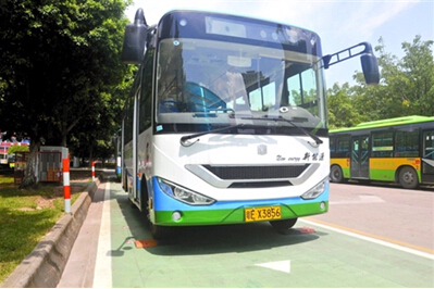 昨日,一輛新能源公交車停靠在無線充電車位內。/組圖由佛山日報記者黎漢沿攝