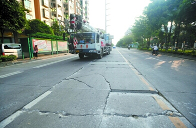 仔細觀察不難發現,以泰華路為分界,兩段丹霞路路面情況有很大的不同。西部路段機動車道上路面破損嚴重,有些石板直接下沉,使路面呈現“臺階”狀。而東側路面則十分完好,幾乎沒有破損之處。區市政管理處相關負責人表示,經過的貨車數量是造成丹霞路兩段路面情況不同的根本原因。“市政道路與省道、國道的建設標準不同,超重車長期通行的話,這里怎么修補也沒有用。”